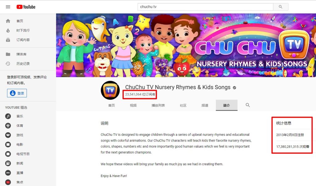 ChuChu TV从2013年开始在Youtube平台上线发布,目前总共有2300万用户的订阅量,播放量达到170亿。